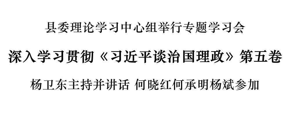 10月16日下午,縣委理論學(xué)習(xí)中心組舉行專題學(xué)習(xí)會,深入學(xué)習(xí)貫徹《習(xí)近平談治國理政》第五卷。市委常委、縣委書記楊衛(wèi)東主持并講話,強(qiáng)調(diào)要深入學(xué)習(xí)《習(xí)近平談治國理政》第五卷,與學(xué)習(xí)第一卷至第四卷貫通起來,與學(xué)習(xí)貫徹習(xí)近平總書記關(guān)心指引安吉發(fā)展的一系列重要講話和重要指示批示精神結(jié)合起來,切實當(dāng)好新時代黨的創(chuàng)新理論的堅定信仰者和忠實實踐者,把學(xué)習(xí)成果轉(zhuǎn)化為推動安吉高質(zhì)量發(fā)展的生動實踐。