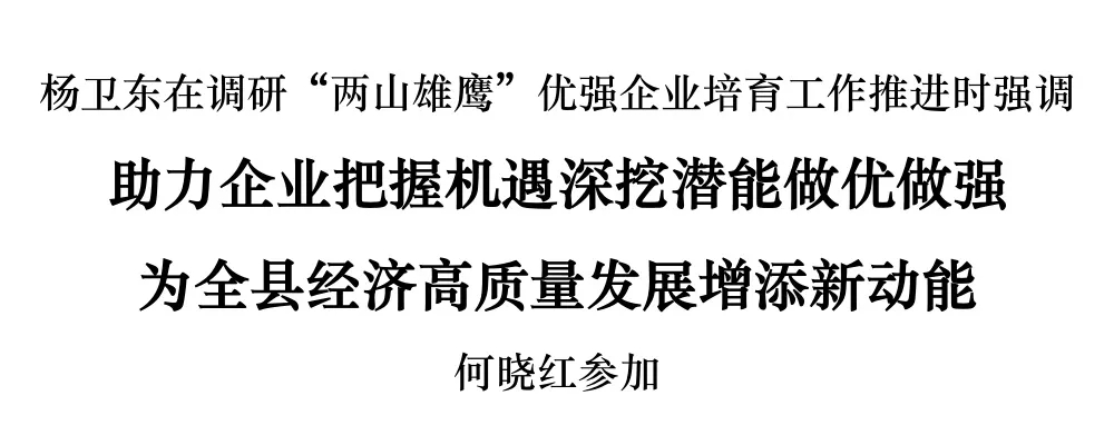 ? ? ? ? 為加快推進“兩山雄鷹”優(yōu)強企業(yè)培育工作,連日來,縣四套班子領(lǐng)導分赴企業(yè),宣講“兩山雄鷹”優(yōu)強企業(yè)培育行動有關(guān)政策舉措,鼓勵廣大企業(yè)堅定信心、搶抓機遇,理清發(fā)展思路、創(chuàng)新發(fā)展舉措,實現(xiàn)更好更快發(fā)展。9月30日下午,市委常委、縣委書記楊衛(wèi)東帶隊調(diào)研“兩山雄鷹”優(yōu)強企業(yè)培育工作推進情況。他強調(diào),要在更高站位、更長遠發(fā)展中審視“兩山雄鷹”優(yōu)強企業(yè)培育工作,進一步優(yōu)服務(wù)、強保障,推動培育行動各項舉措落細落實,助力企業(yè)把握政策機遇、深入挖掘潛能、加快做優(yōu)做強,為全縣經(jīng)濟高質(zhì)量發(fā)展增添新動能。縣領(lǐng)導何曉紅、童師祥、管永豐、徐晟分別參加。