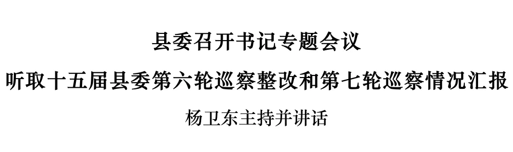 8月18日上午,縣委召開書記專題會議,聽取十五屆縣委第六輪巡察整改情況及第七輪巡察工作情況專題匯報(bào)。市委常委、縣委書記楊衛(wèi)東主持會議并講話。縣委副書記、縣長寧云,縣委常委、縣紀(jì)委書記、縣監(jiān)委主任、縣委巡察工作領(lǐng)導(dǎo)小組組長王宗明參加。相關(guān)被巡單位分管縣領(lǐng)導(dǎo)列席。