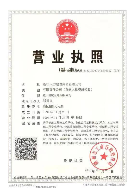 浙江天力建設集團有限公司(曾用名:浙江天力建筑有限公司),成立于1994年,浙江天力建設集團成員,位于浙江省湖州市,是一家以從事房屋建筑業為主的企業。企業注冊資本38000萬人民幣,實繳資本15080萬人民幣。